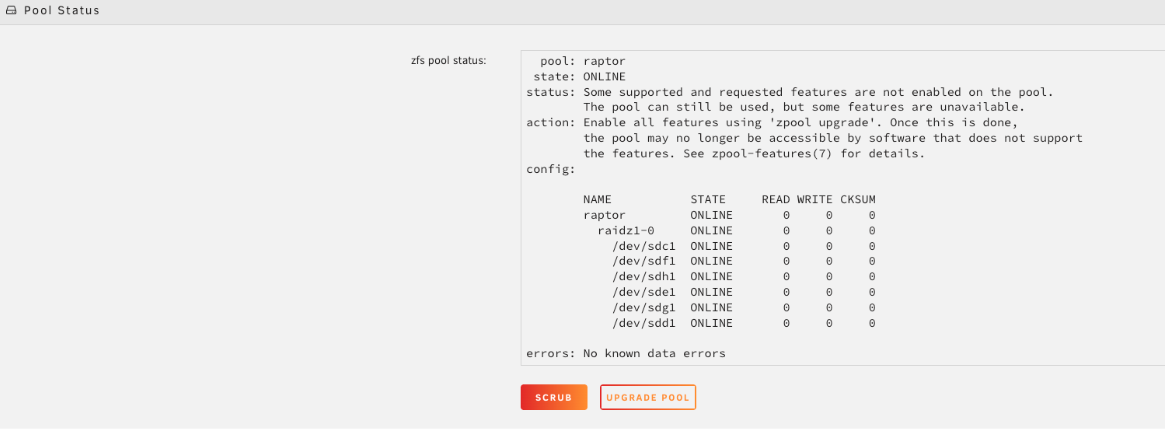 • Unter Poolstatus den Status überprüfen und auf Scrub klicken.