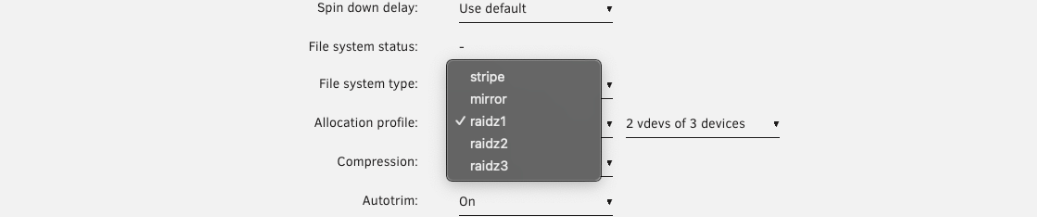 - RAIDZ1 : 3, 5 ou 9 disques (disques de données = 2, 4 ou 8)