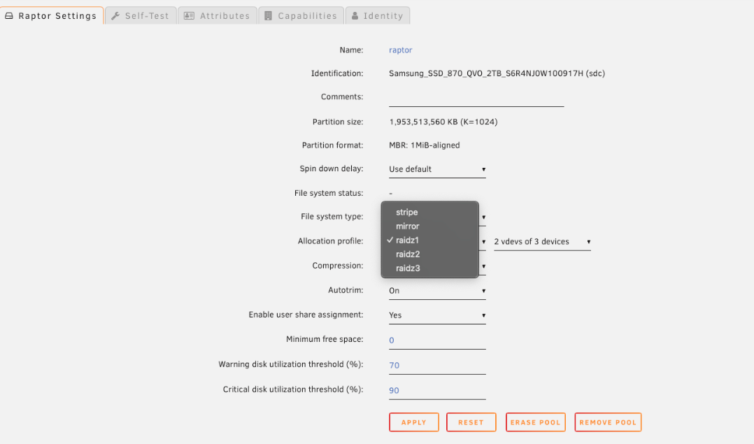 raptor) pour ouvrir son écran de configuration. - Définissez le type de système de fichiers sur